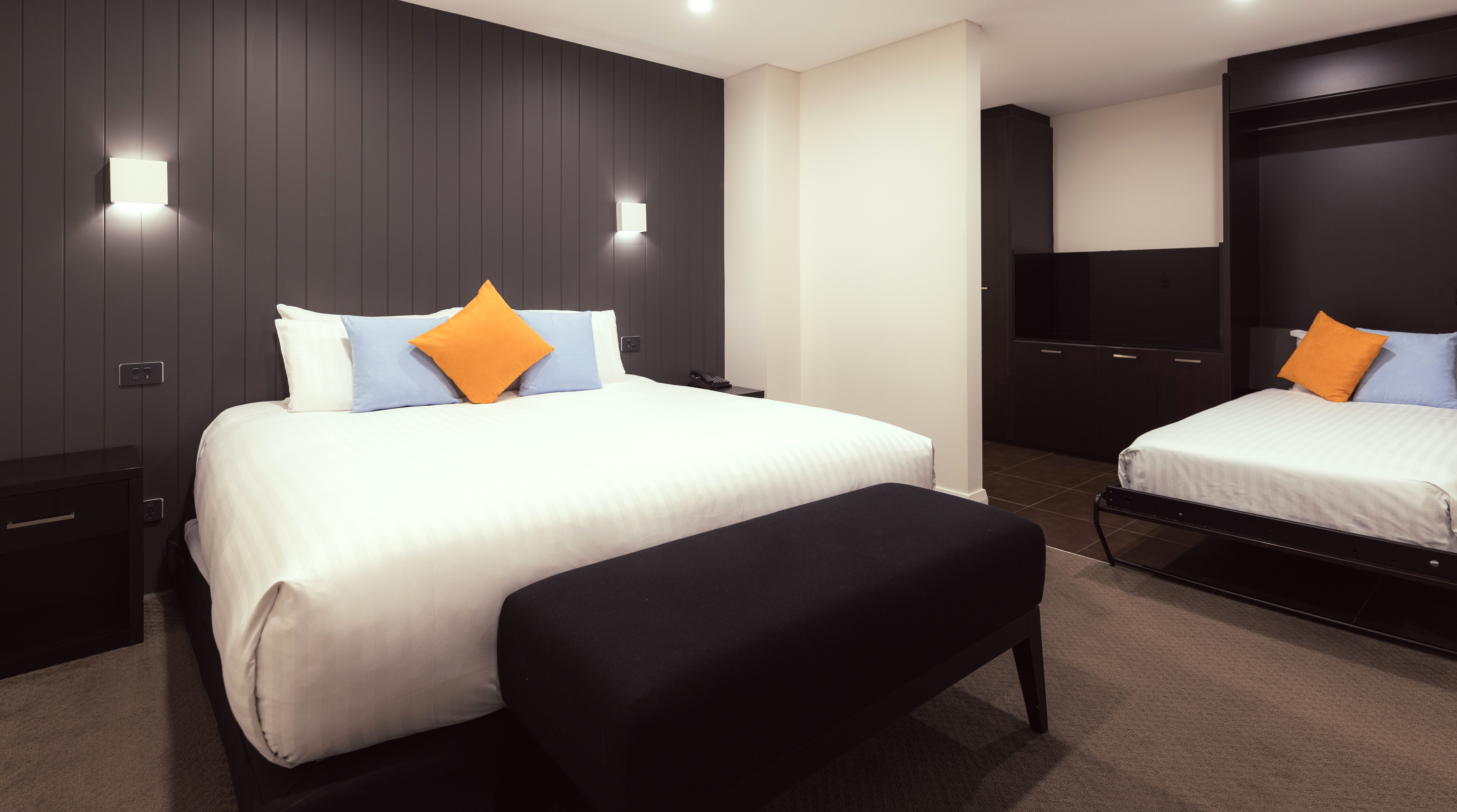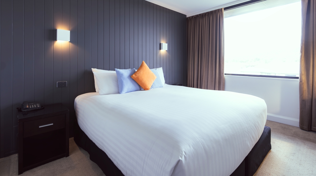 Offering timeless classic neutral colours, furnishings, and the Rex “Cloud” twin king beds. A dedicated work desk and lamp is ready for that business catch-up. The easy access shower with hand spray is framed by floor to ceiling tiles in the well-equipped bathroom.