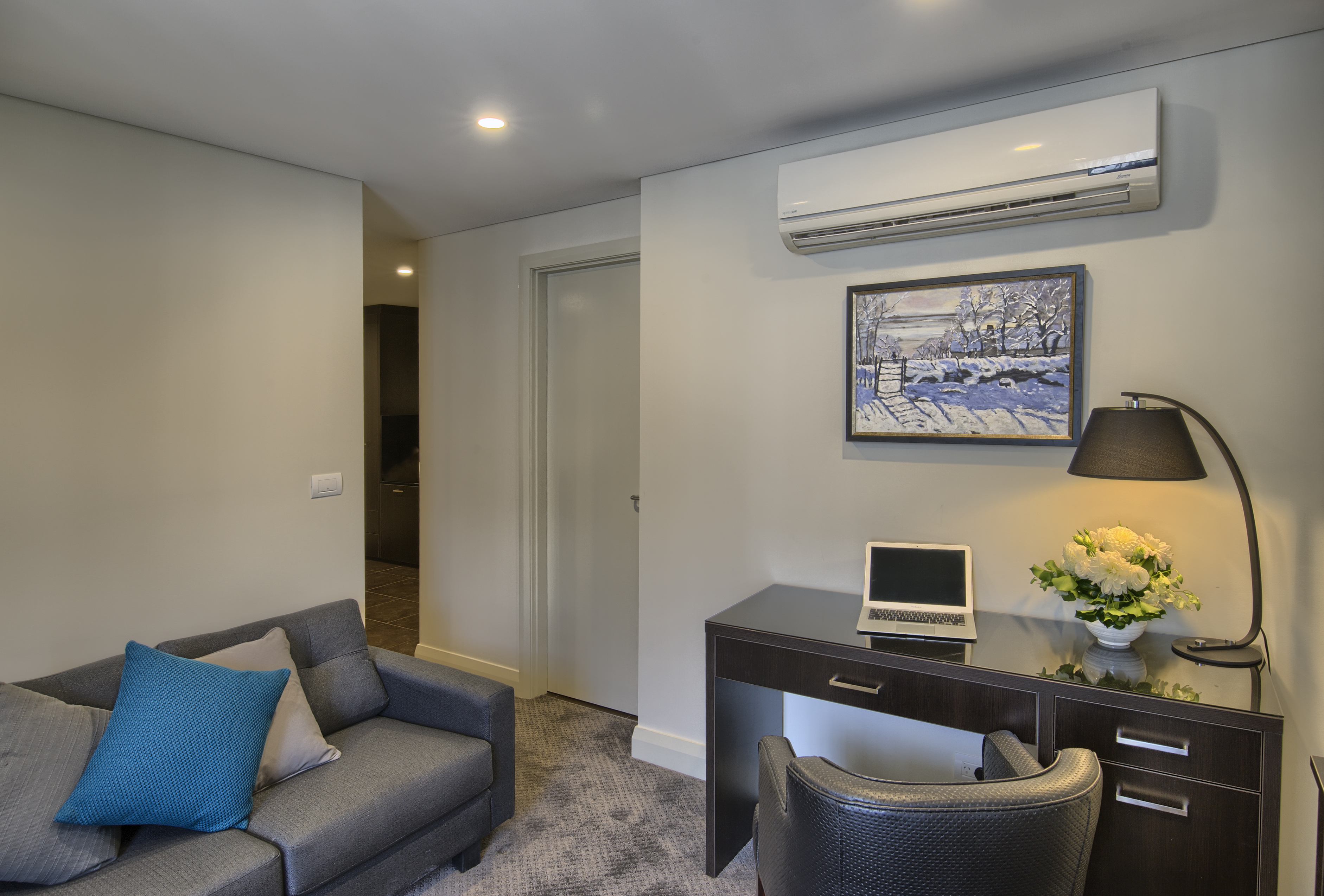 Offering timeless classic neutral colours, furnishings, and the Rex “Cloud” king bed. A dedicated work desk and lamp is ready for that business catch-up. The easy access shower with hand spray is framed by floor to ceiling tiles in the well-equipped bathroom.