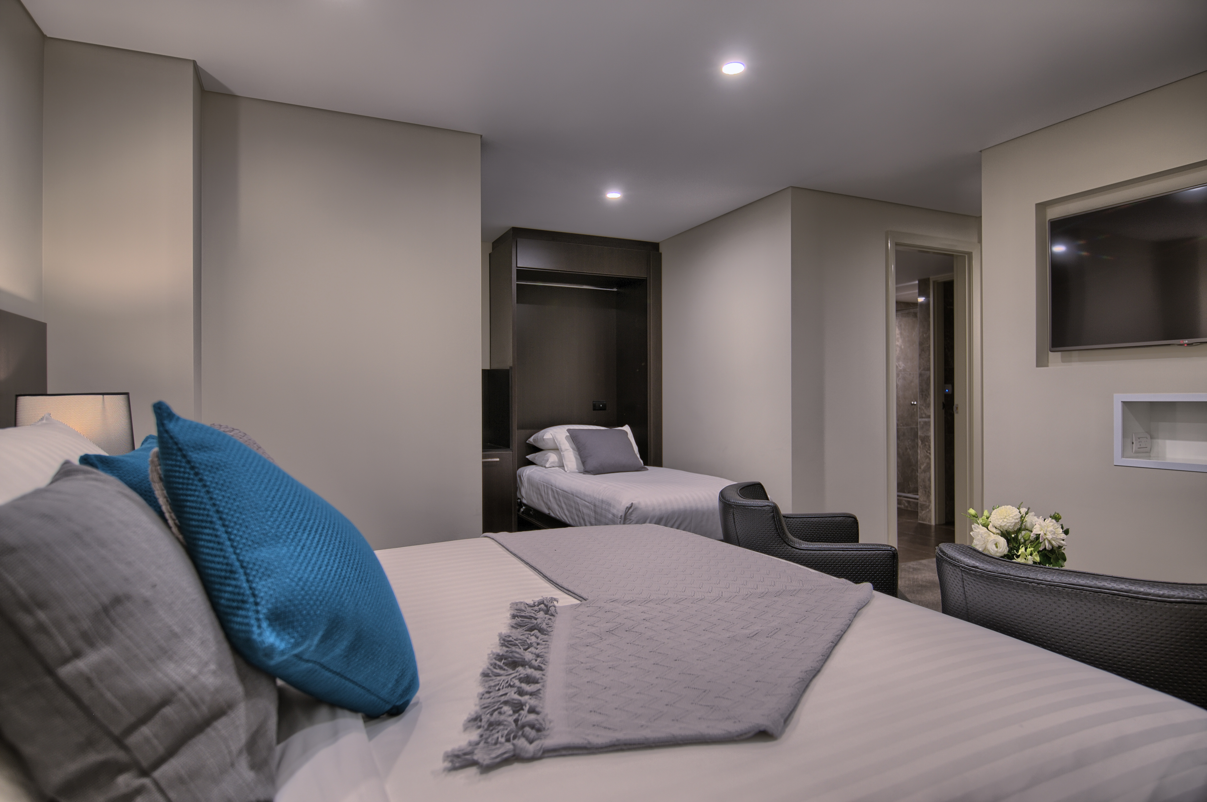 Beautifully appointed, newly renovated King Suite feature a luxurious marble bathroom, plasma TV, King ‘Rex Cloud Bed’ & Manhattan single bed. The separate sitting area provides a generous space to relax in with a plasma TV, sofa amd a work desk.