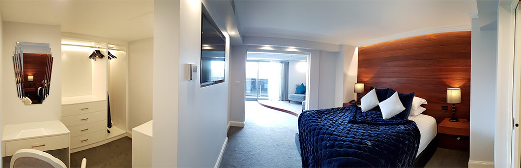 These suites offer a sense of space and privacy exuding a sense of sophisticated calm. A separate sitting area with LCD television, lounge, arm chair and a built in work station for the executive on the move. Walk through to the Rex “Cloud” King bed and another LCD television.
